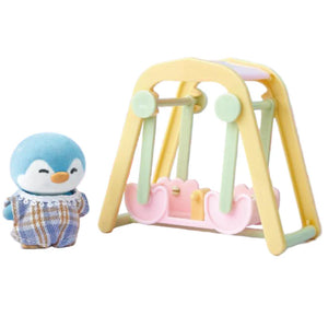 Design: Soft, flocked plush family accompanied by a miniature swing set with seat and frame.